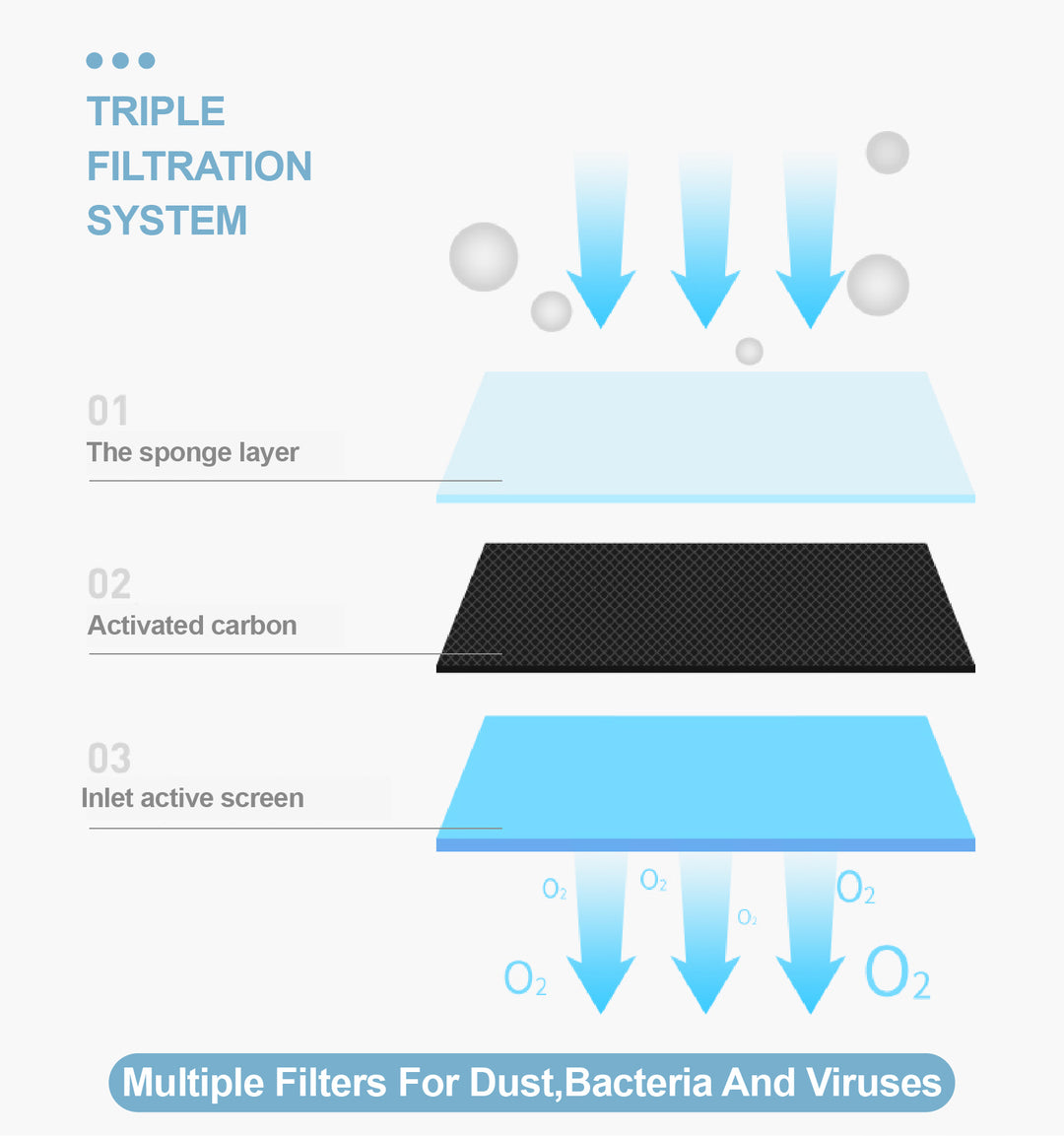 • Triple filtration system:The three-level layer-by-layer filtration system deeply cleans the air before the oxygen is released, and efficiently filters out impurities such as fine dust.